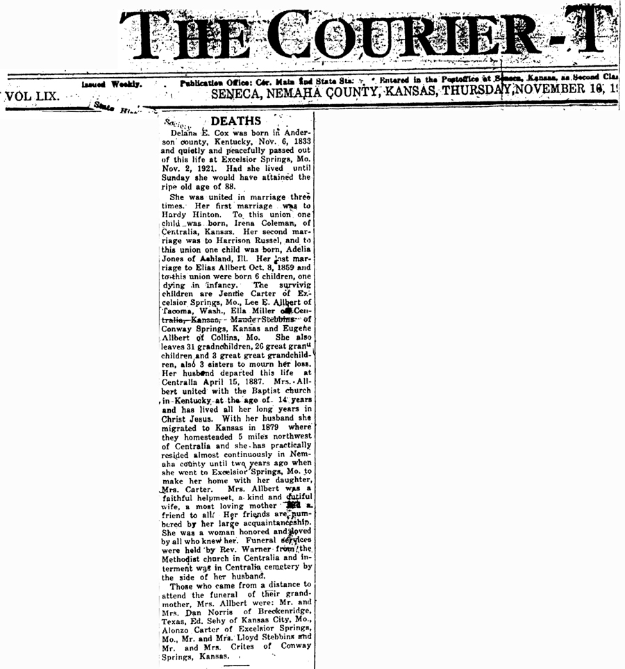 She was born 06 Nov 1833 in Anderson Co, KY, and died 02 Nov 1921 in