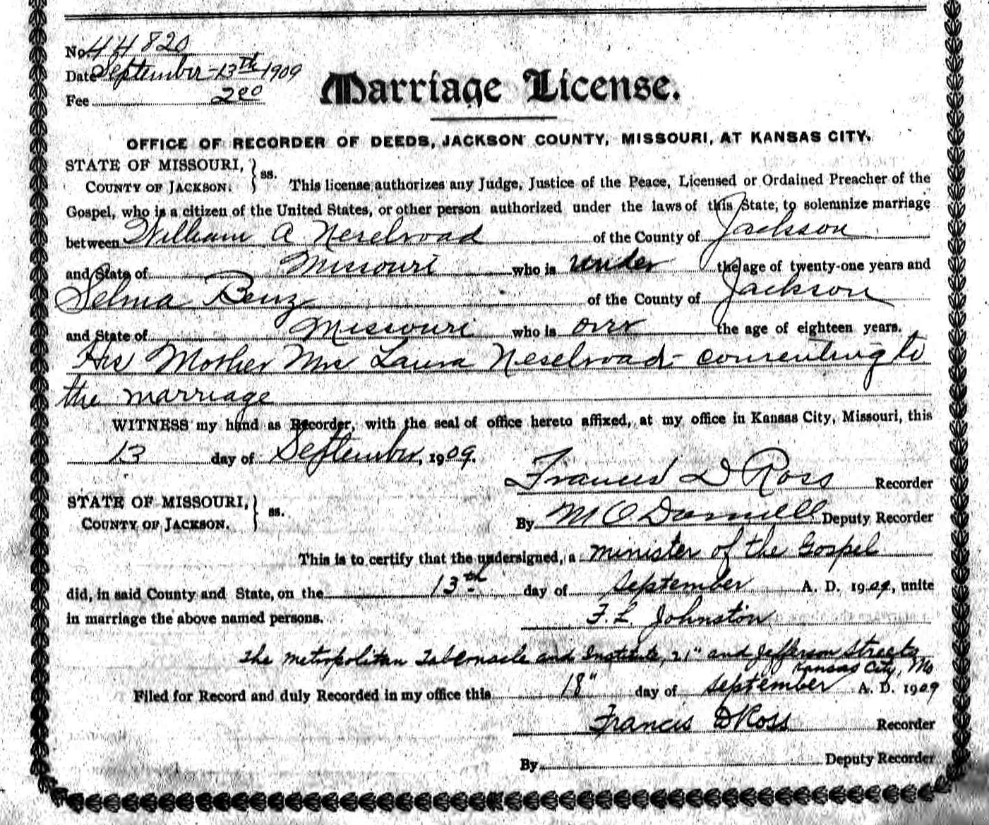 Vernon County Missouri. They were ages 22 and 16. The marriage was