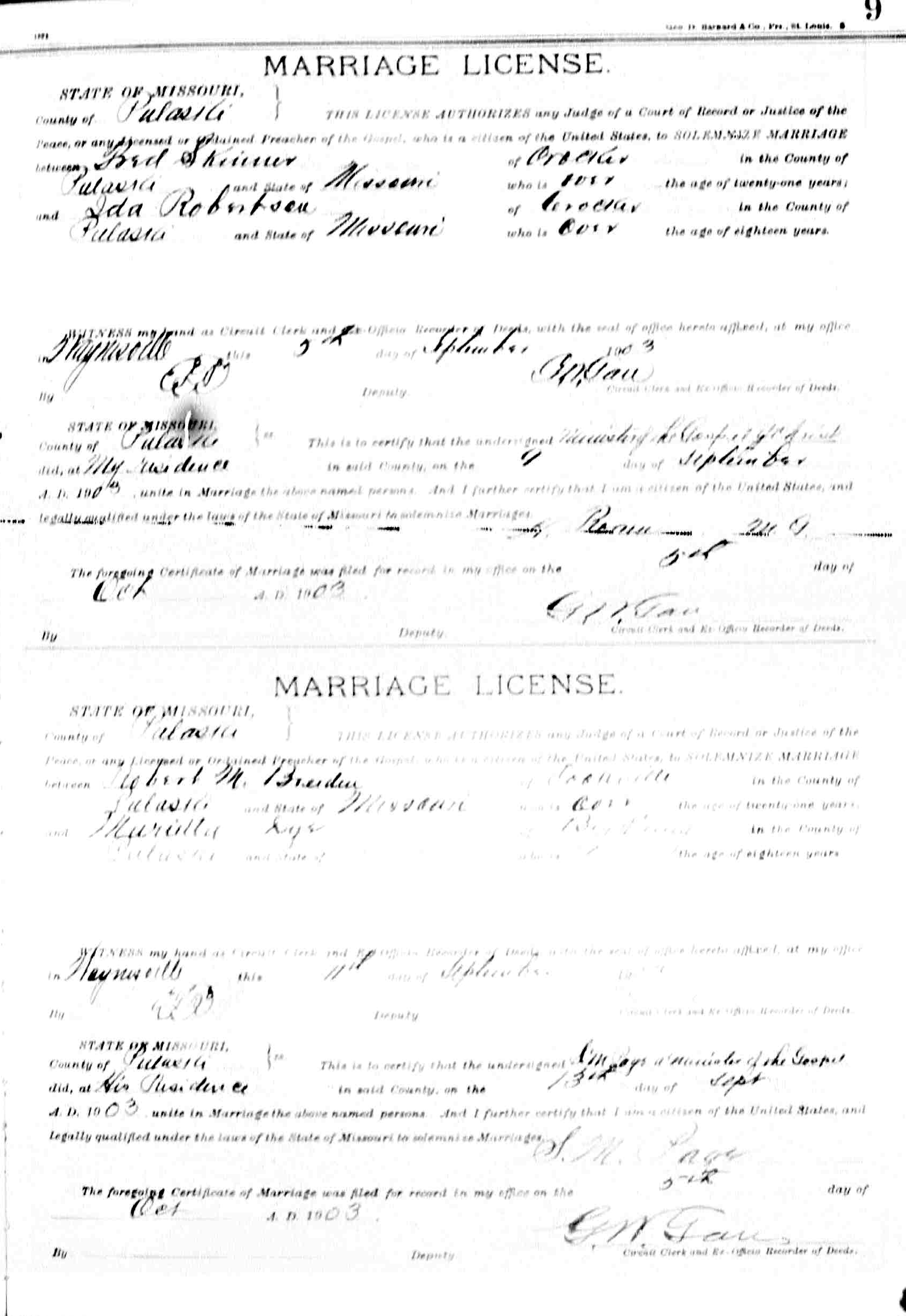 On 9 Sep 1903 when Frederick Marion was 23, he married Ida Jane Robertson, F, daughter of William C Robertson, M (1847-1907) & Eliza Ellen Robertson, F (1848-1925), in Crocker, Pulaski Co, MO. Born on 31 Dec 1883 in Pulaski Co, MO. Ida Jane died in Jackson, MO, on 21 Sep 1972; she was 88.