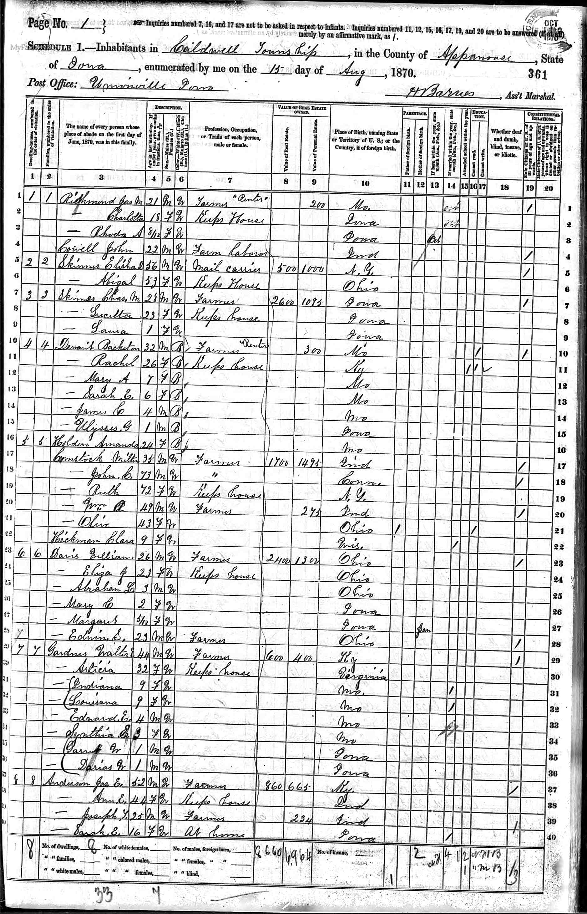 10. Charles Marion Skinner, M. Born on 31 Jul 1842 in Jefferson Co., IA. Charles Marion died in Cassville, Barry Co., MO, on 15 Sep 1914; he was 72.